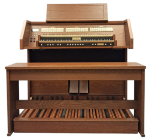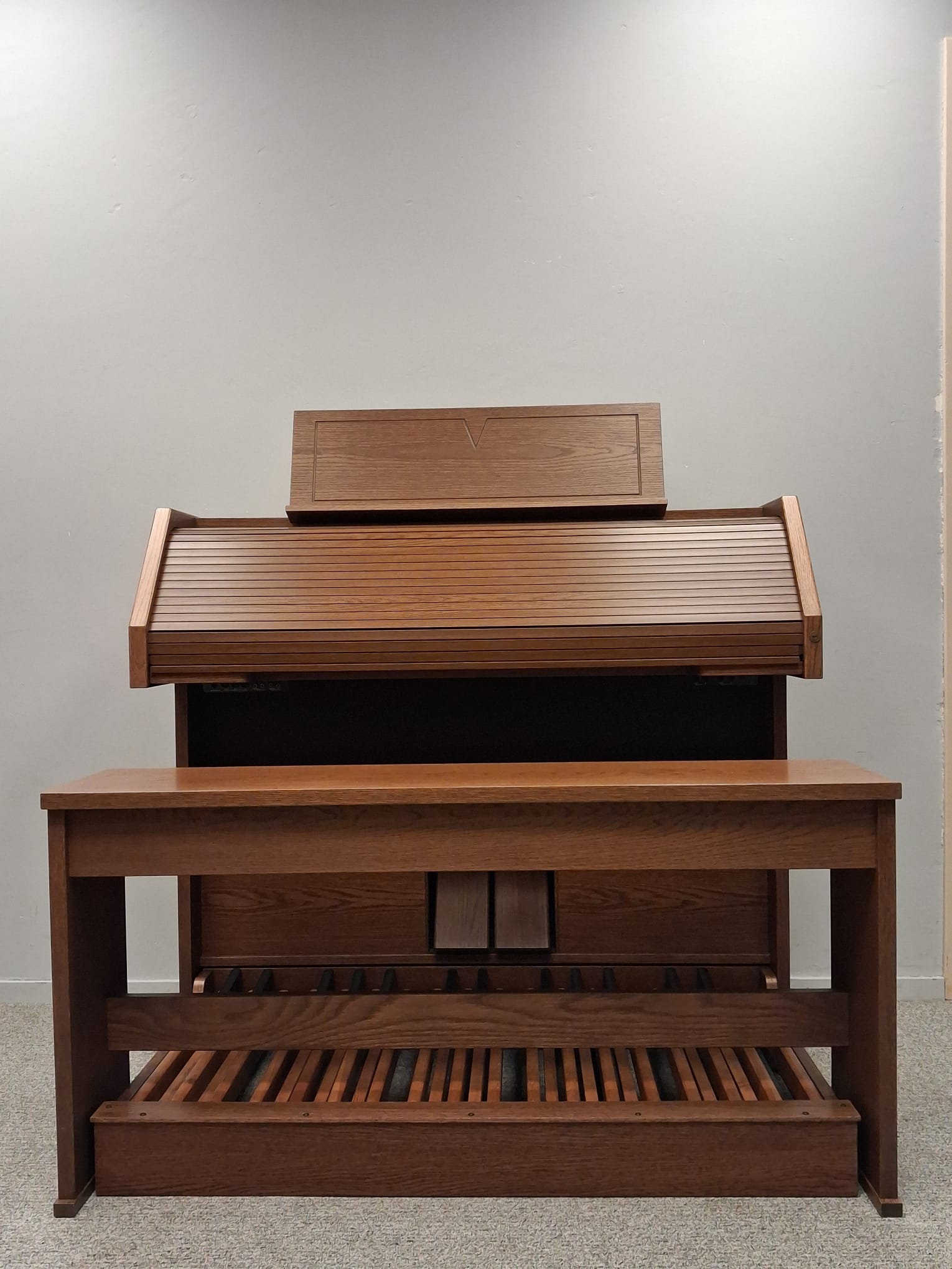Klassiek orgel met donker eiken kast, met 5x 31 digitaal gesampelde stemmen. 2 Klavieren met 5 octaven en drukpunt, patent van Domus. Volledige manuaal en pedaalkoppels. Versterking van 3 x 70 watt stereo. 36 Vrij te combineren registercombinaties, met + en – knoppen kunt u eenvoudig uw combinatie oproepen. Houten zweltreden voor Manuaal I en Pedaal en Manuaal II. Volumeregeling voor stereo nagalm. Display met de volgende instellingen; 5 intonaties waarvan 2x Barock, 2x romantisch en 1x Symphonisch; 110 extra stemmen bibilotheek; Volumeregeling voor elke stem; Keuze uit 8 verschillende nagalmen; regelbare tremulanten; Keuze uit oude stemmingen o.a. werckmeister/midden toon; Equalizer voor het in balans brengen van het orgel in de huiskamer. Dit instrument heeft veel mogelijkheden. Veel instellingen kunnen eenvoudig met behulp van het instellingen menu met tiptoetsen geprogrammeerd worden, zoals stemvolumes, tremulanten, stemming, intonaties. Kortom een geweldig orgel.